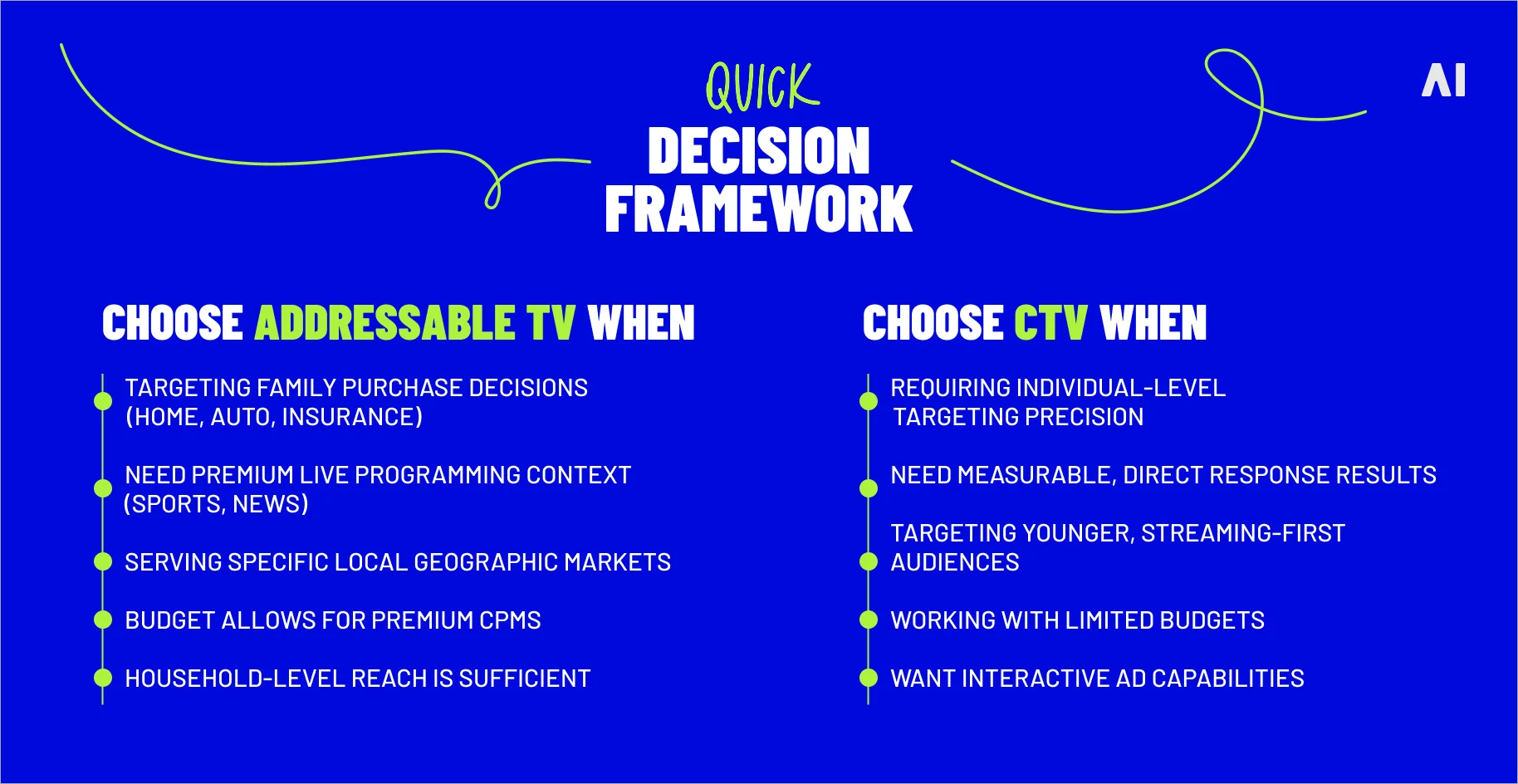 The trade-off becomes clear: CTV offers sharper targeting for individual consumers, while addressable TV provides reliable household-level reach.