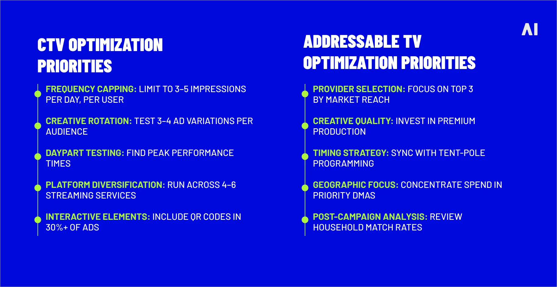 For addressable TV campaigns, focus on creative quality and timing. Since you can't optimize in real-time, pre-campaign testing becomes crucial. Partner closely with providers to access the best inventory matching your target households, and negotiate for post-campaign analytics to inform future efforts.