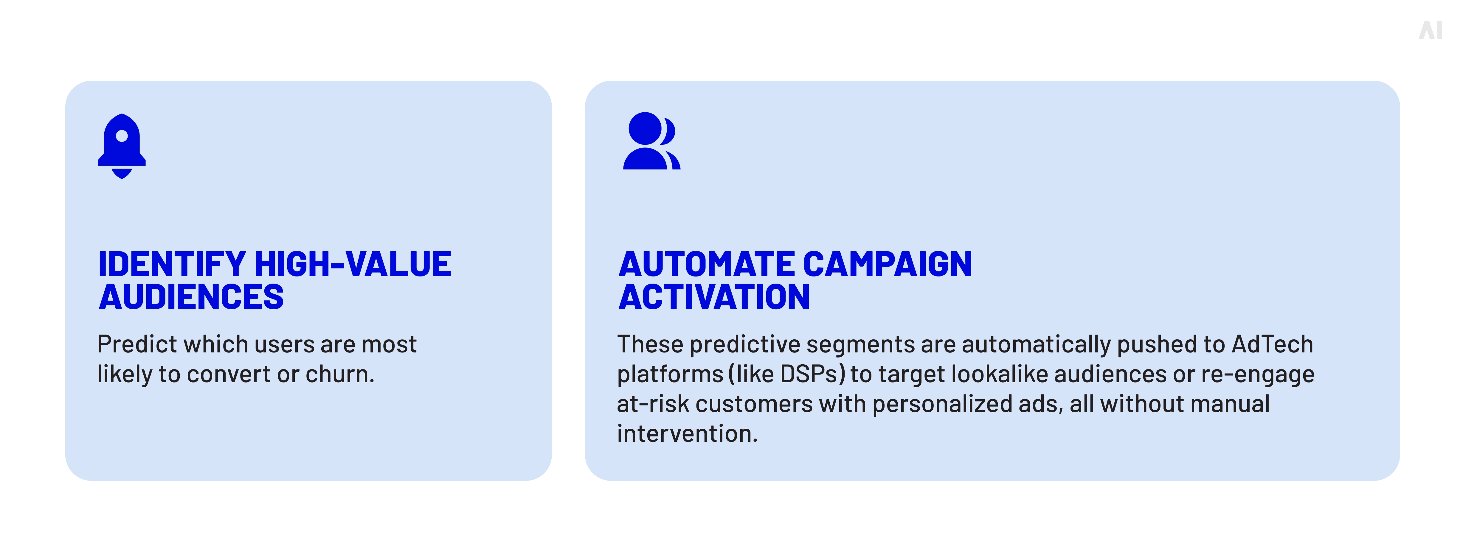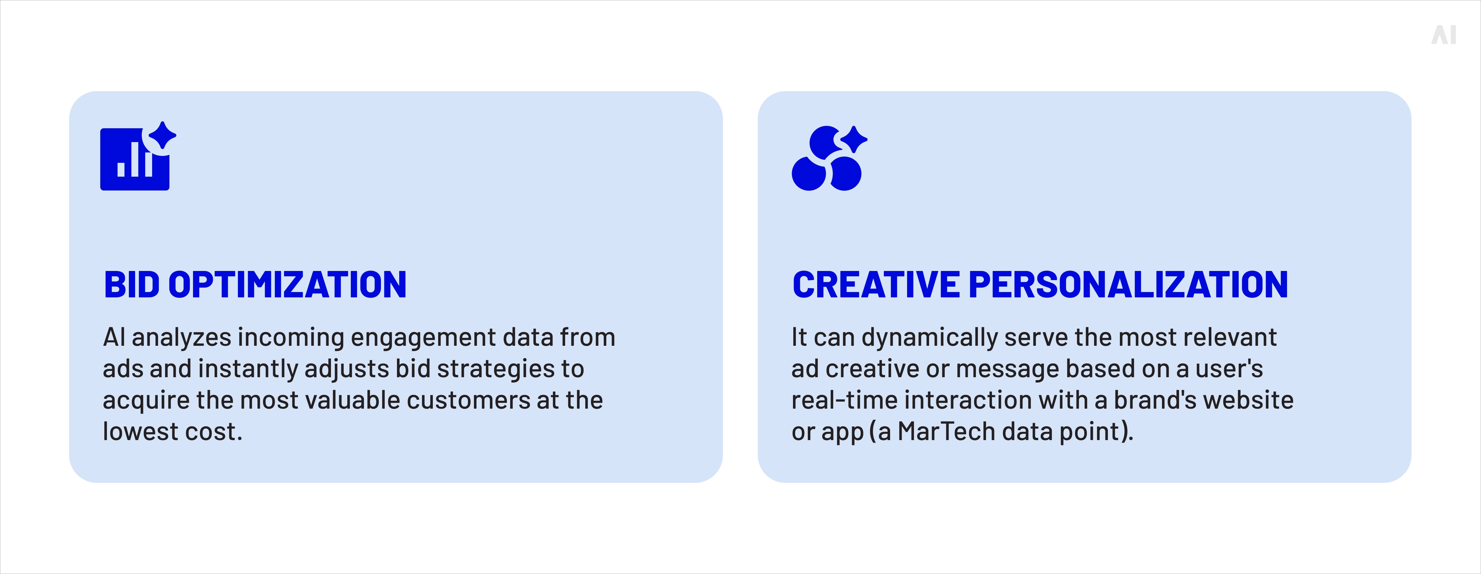 AI acts as the connective tissue between MarTech and AdTech. Machine learning models analyze customer data from both systems to predict behaviors, personalize ads and messages, and automate decisions in real time.