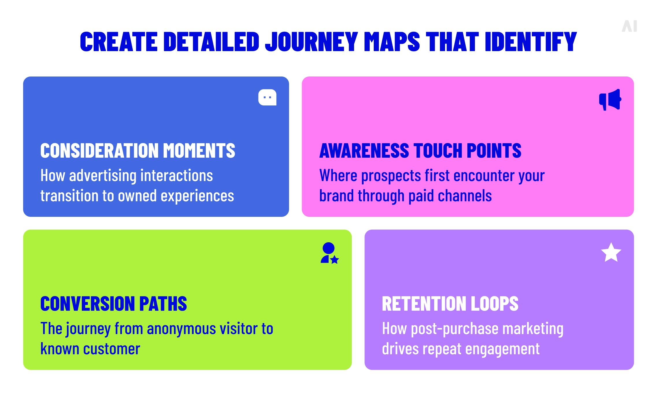 This exercise reveals critical handoff moments between paid advertising and owned marketing channels where experiences often break down.