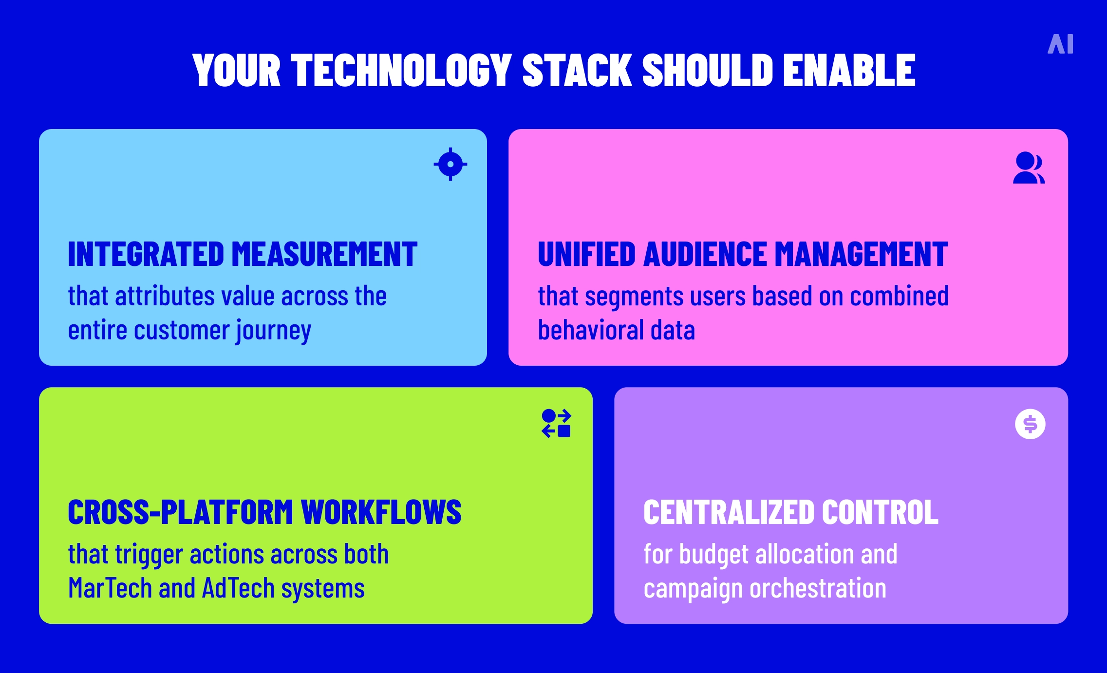 The convergence forces a fundamental shift from channel-specific metrics to shared business outcomes. Organizations that align MarTech and AdTech teams around unified KPIs see 40% faster growth and 30% higher marketing efficiency.