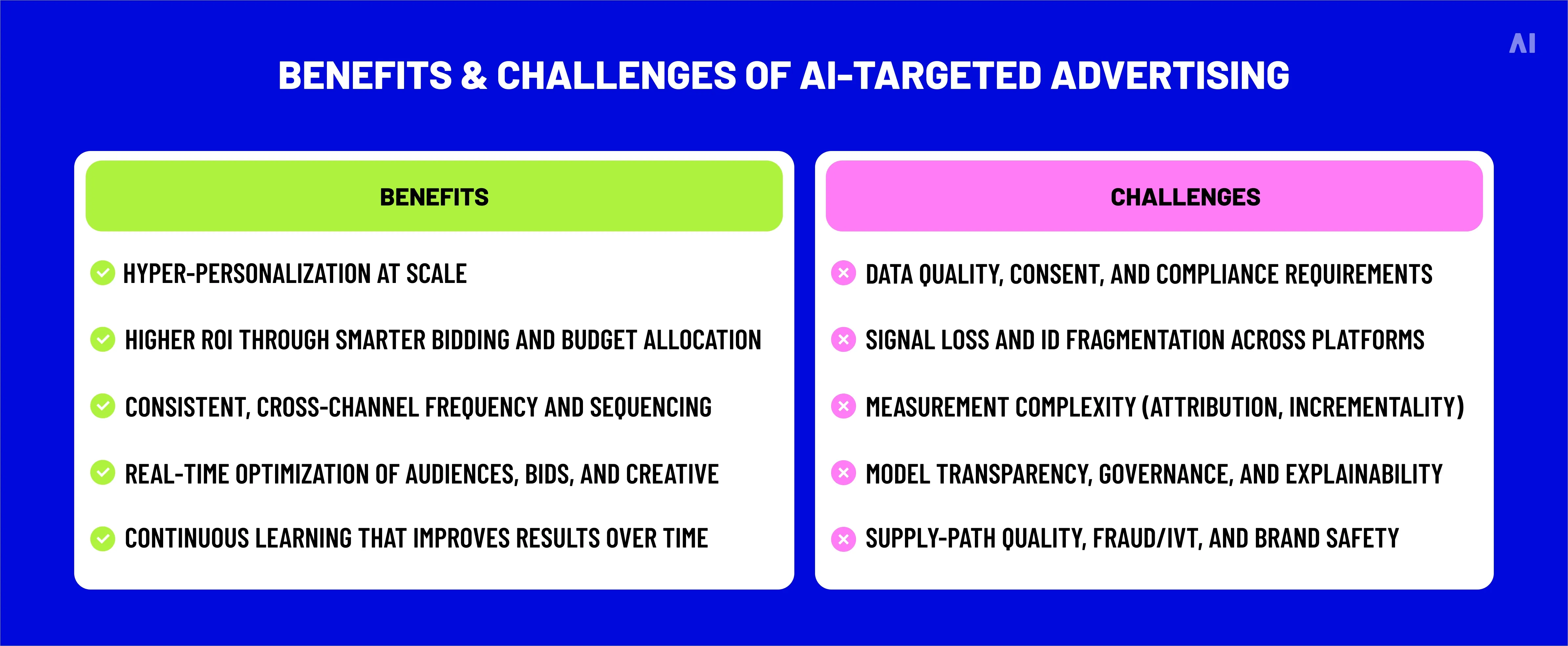 AI targeting replaces brittle rules with a learning system. Models translate consented and contextual signals into probabilities, and the ad stack uses those probabilities to decide audience, message, and timing — then folds outcomes back into the model. The payoff shows up in three places: deeper personalization, tighter unit economics, and steadier results across channels.