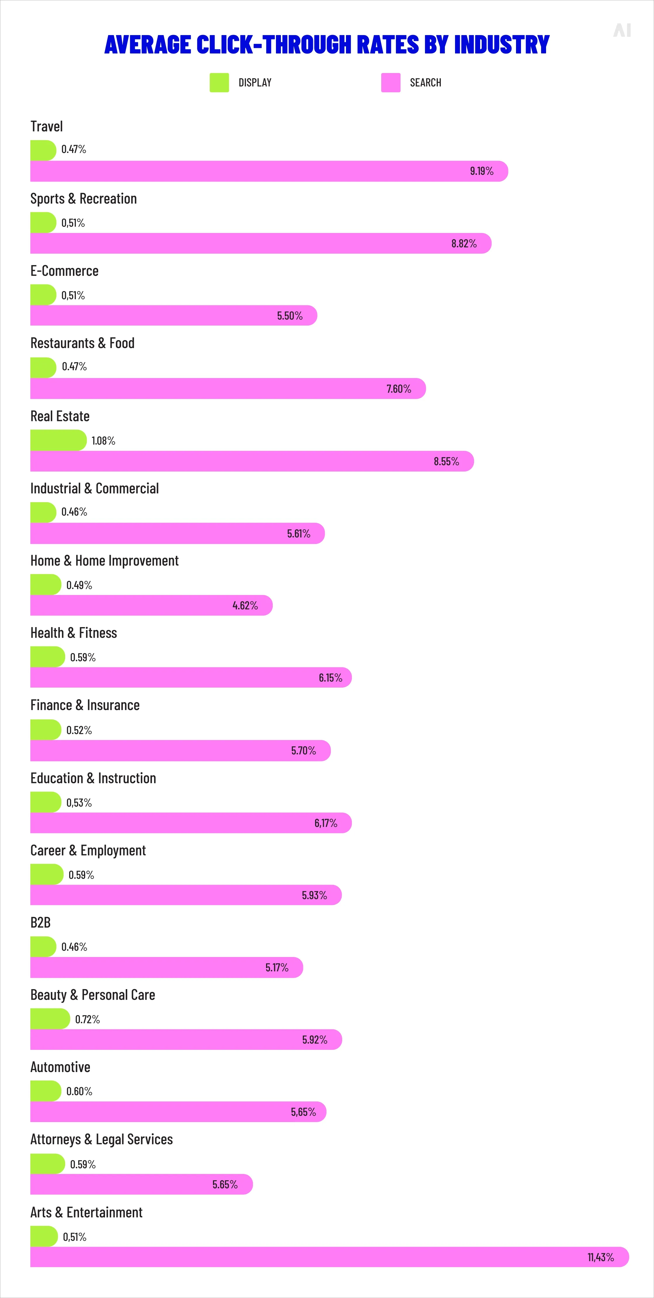 Based on 2025 data, industries characterized by high-intent, problem-solving needs, or visual aspiration consistently achieve the highest display advertising statistics for CTR. The top performers include: Real Estate (1.08%): Driven by users actively searching for properties.