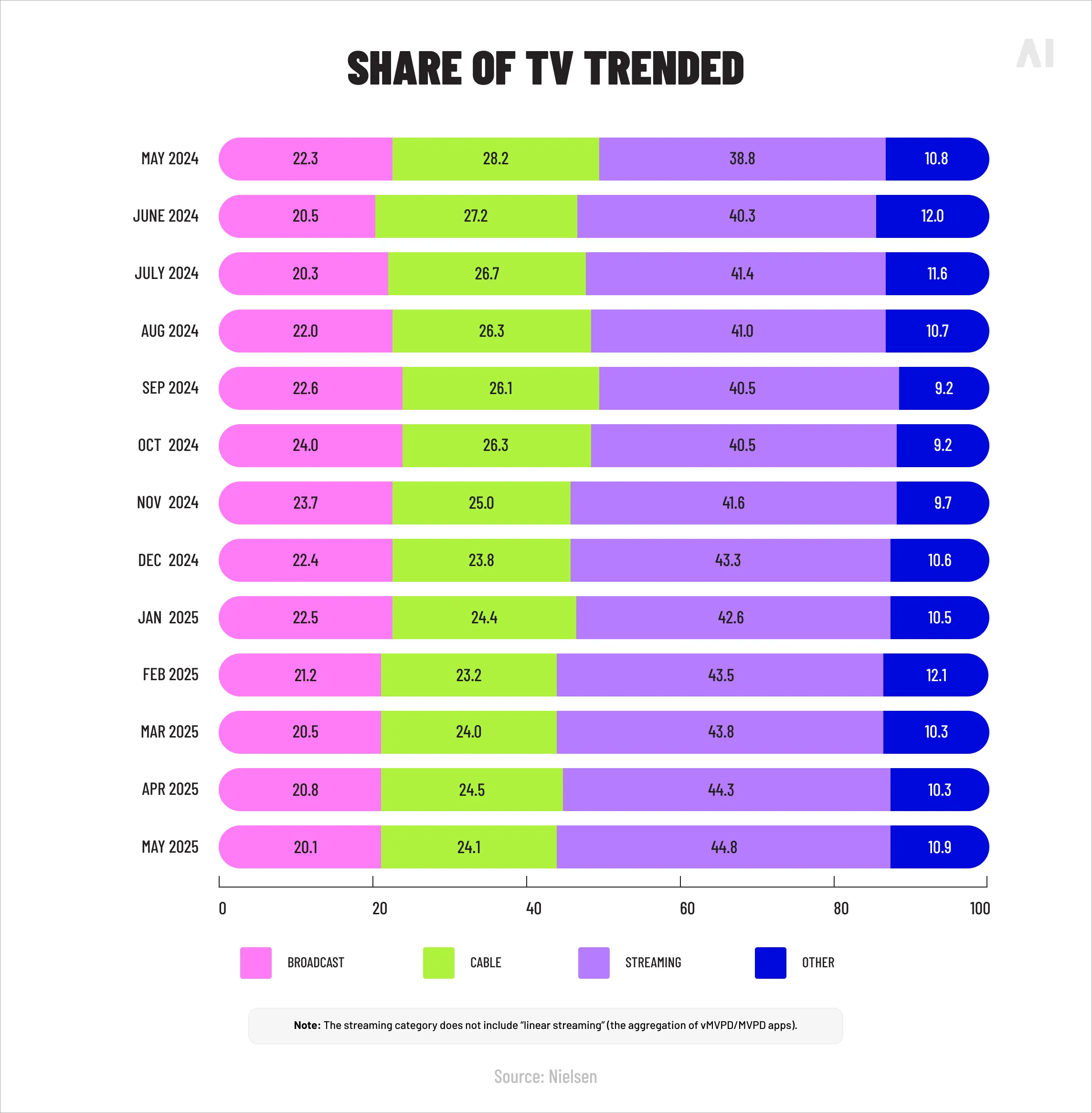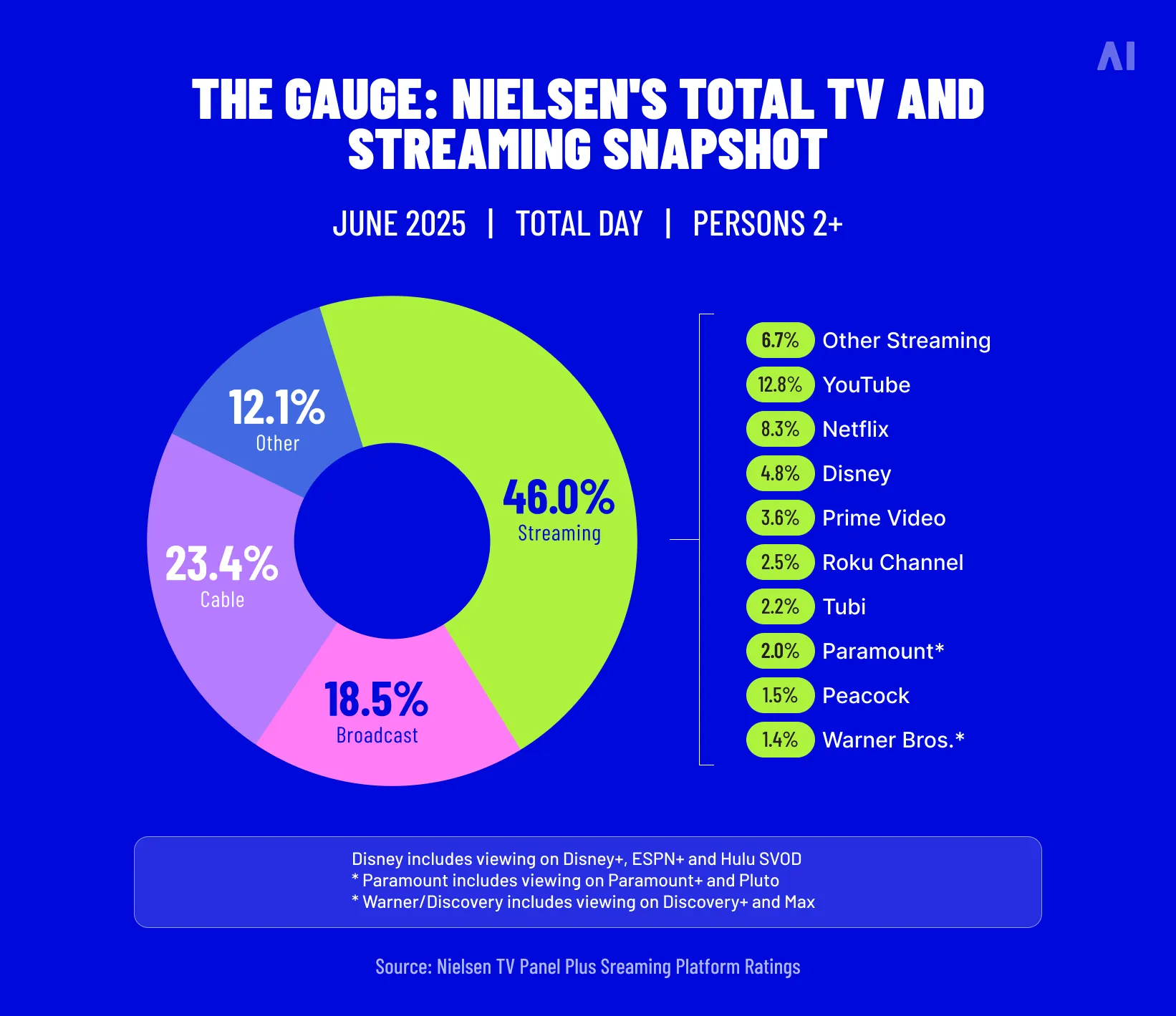 Declining viewership: Younger audiences are spending far less time with traditional television. Streaming surpassed cable and broadcast combined, taking 46 of TV time in June this year.
