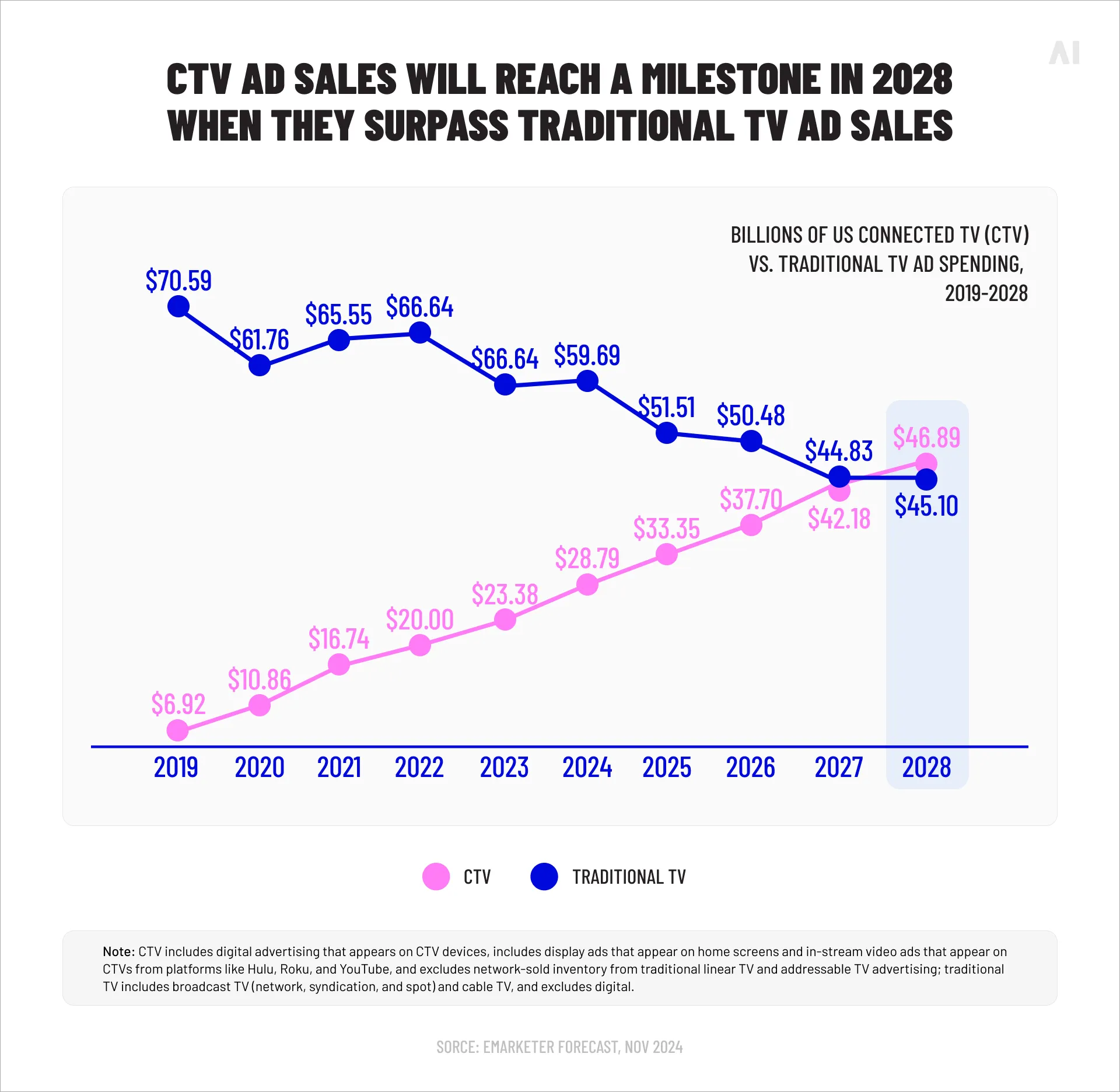 Ad spending is following audiences. U.S. CTV ad spend passed $20 billion in 2023 and is forecast to grow another 12–13% in 2025, reaching around $25 billion. By contrast, linear TV ad spend is projected to shrink from $60.56 billion in 2024 to $56.83 billion in 2027.