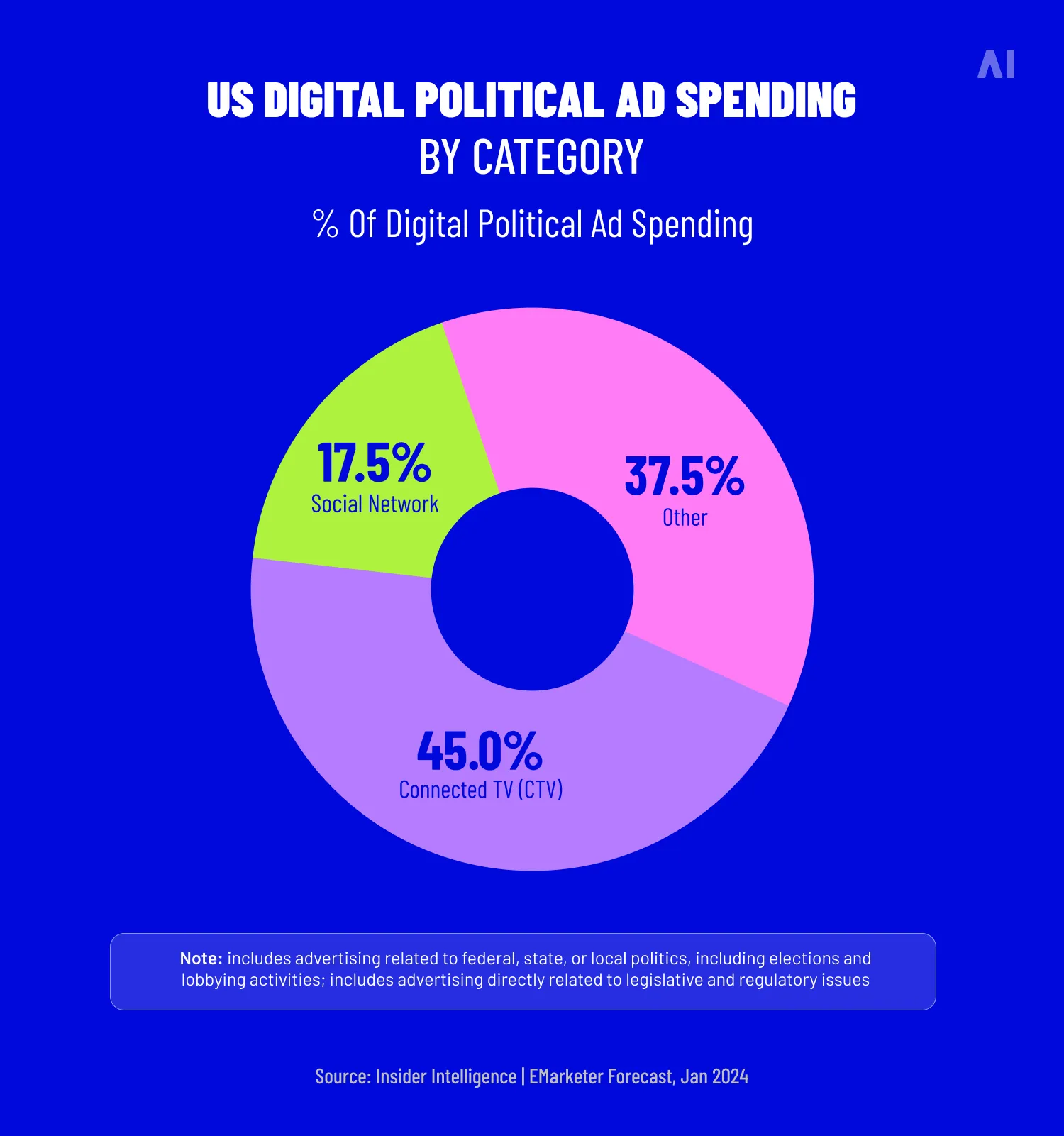 Political advertising: Linear delivers visibility during debates and local news, while CTV has grown rapidly for voter targeting. Between 2020 and 2024, political CTV spending grew more than 500%, making it indispensable for modern campaigns.