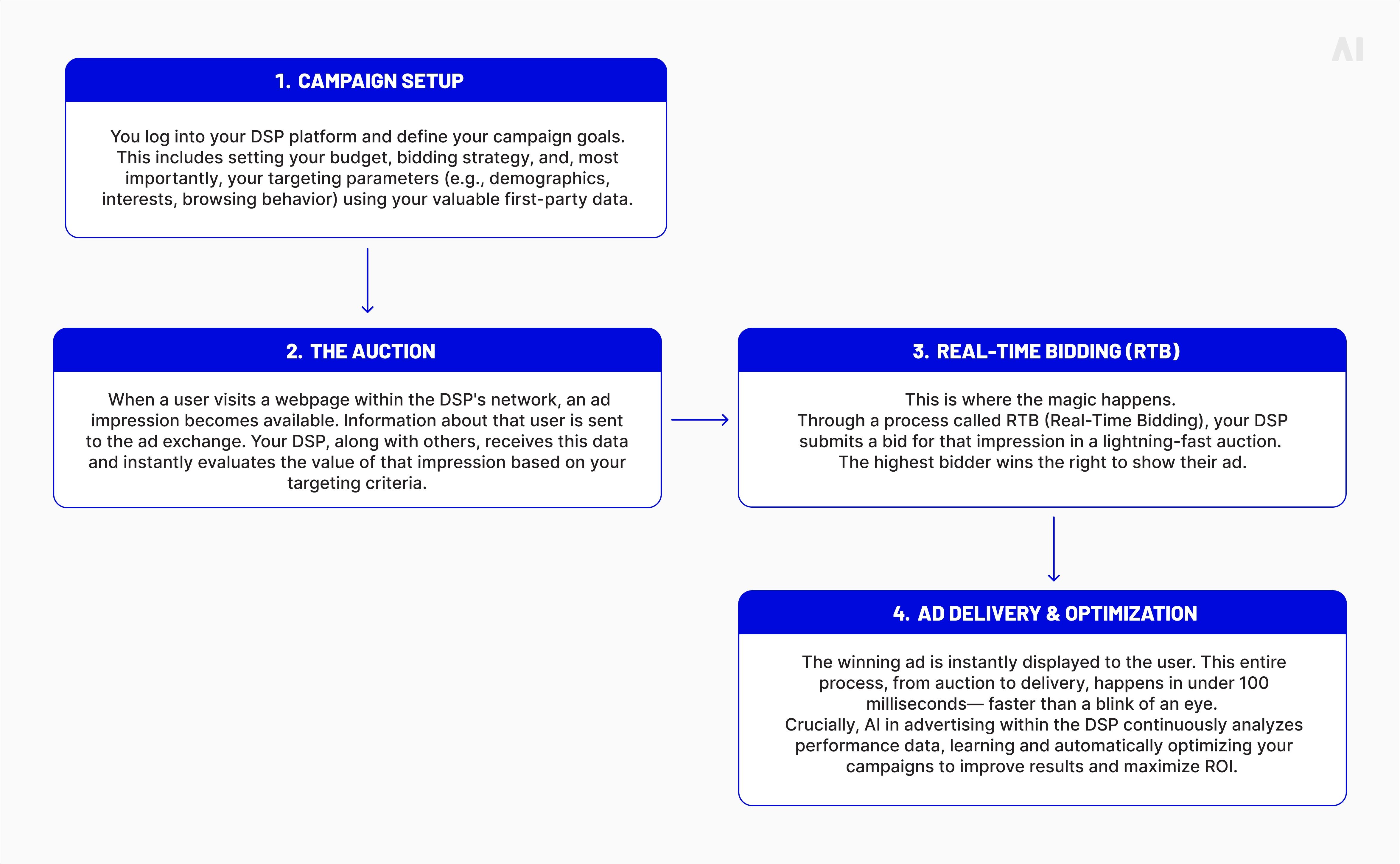 Data from past campaigns informs the DSP's future bidding decisions, constantly refining targeting and optimization.