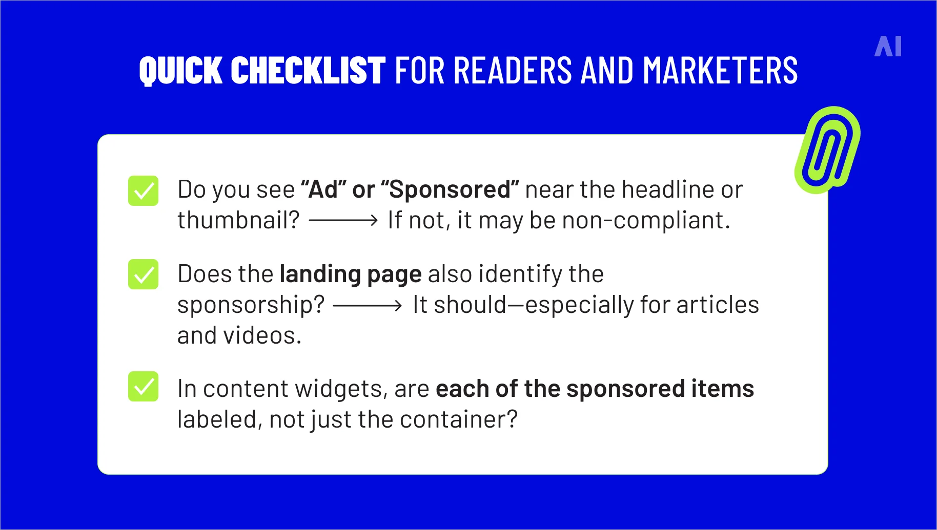⚡ If the disclosure isn’t visible before you click or tap, fix the placement. The label should be obvious on the unit and on the landing page.
