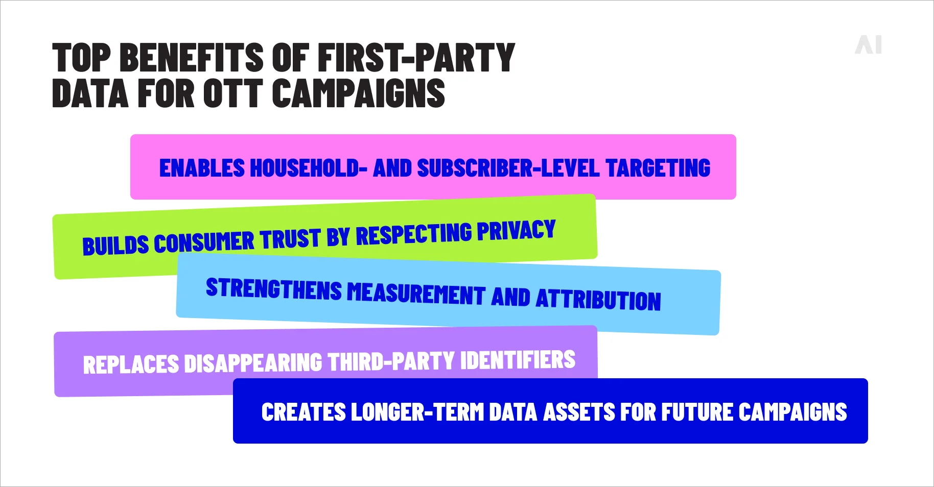 For OTT specifically, first-party data enables targeting at the household or subscriber level, ensuring ads reach real customers instead of broad demos. Retailers, streamers, and subscription businesses are pairing CRM records with streaming logins to activate campaigns across CTV. This not only keeps targeting compliant but also builds consumer trust—one in three U.S. consumers say they think more highly of brands that safeguard their data.