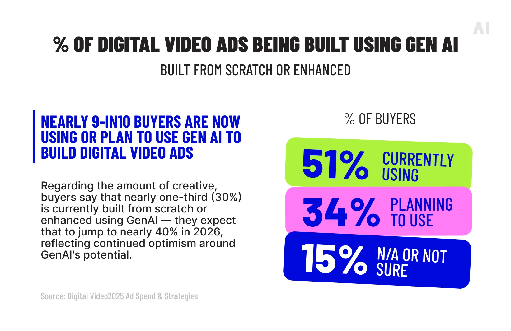 In one IAB study, 86% of advertisers said they are testing or planning to test generative AI tools for video ads, feeding directly into dynamic creative strategies.