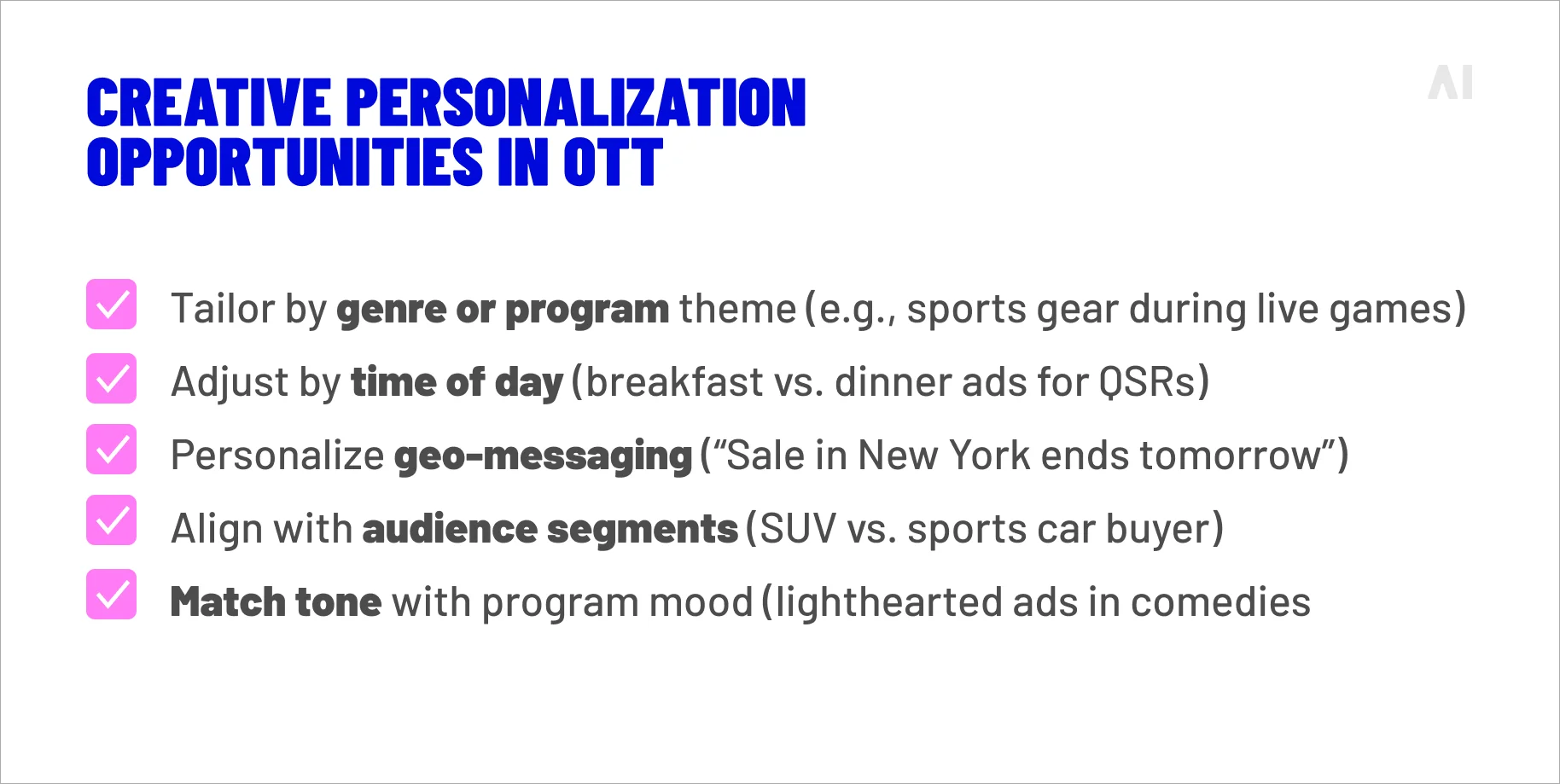 📌Actionable insight: Personalization in OTT can be subtle yet powerful, aligning ad tone and subject matter with viewer interests makes the message stick. Agencies can combine audience data with contextual placement to tailor both creative and media plans. Test creative variants for specific segments, and don’t overlook geo-based or time-of-day personalization for relevance.