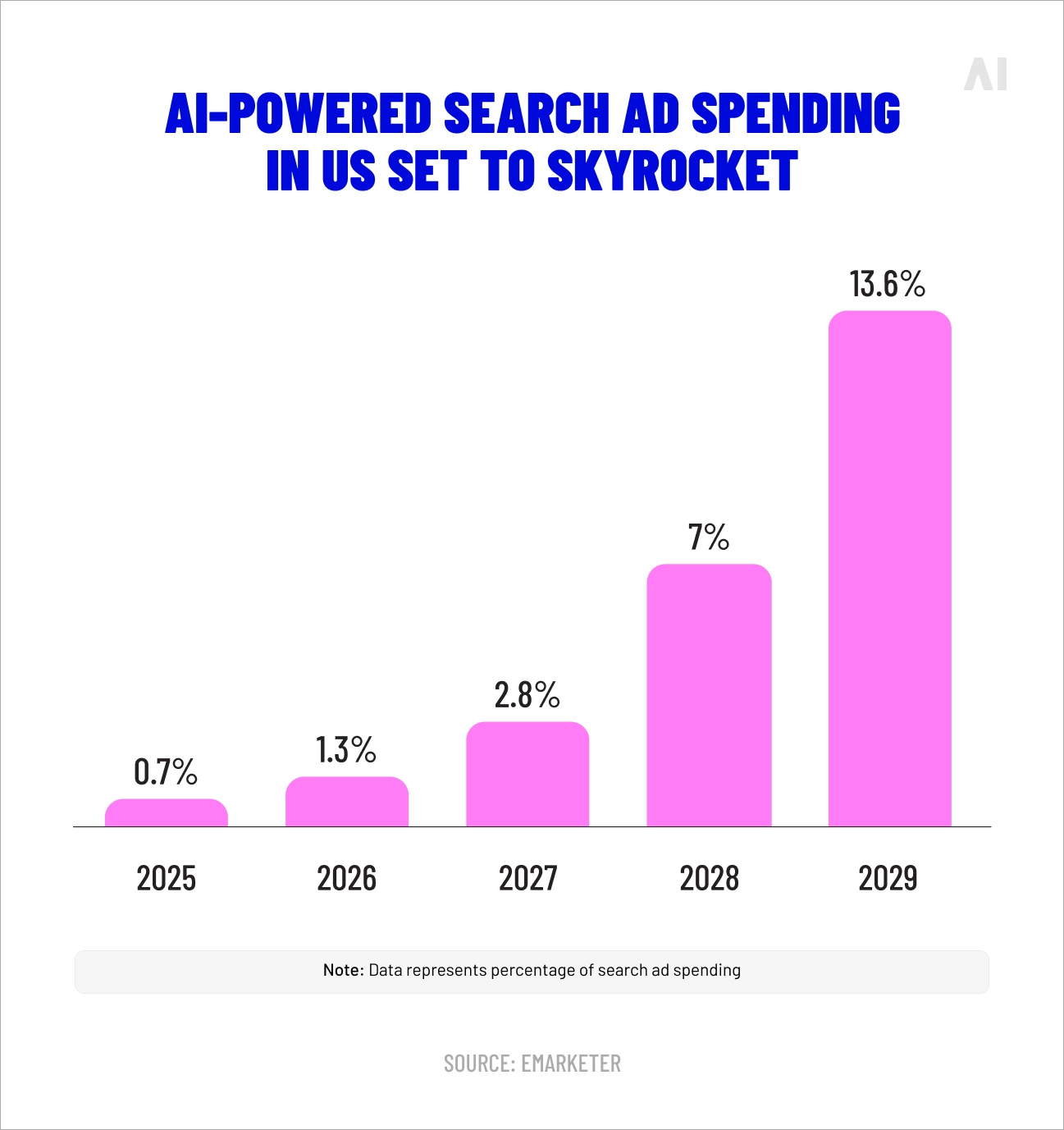 Modern buying platforms apply machine learning to audience expansion, bidding, and creative selection. As AI reshapes search and social delivery, spend is shifting toward AI-driven placements; eMarketer data projects U.S. AI-driven search ad spend rising from ~1% of search in 2025 to 13.6% by 2029, reflecting rapid adoption of AI-assisted targeting and optimization.