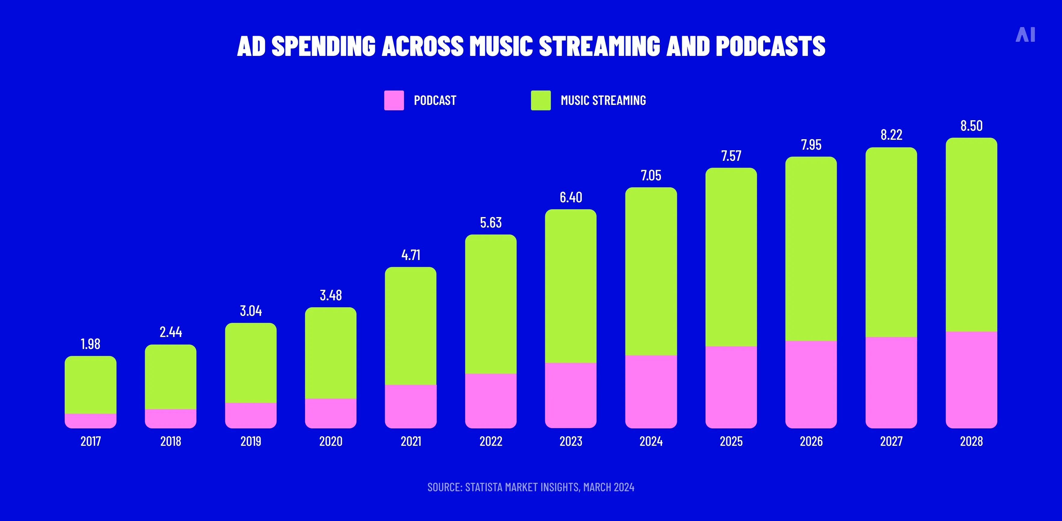Ad spending across music streaming and podcasts (Source)