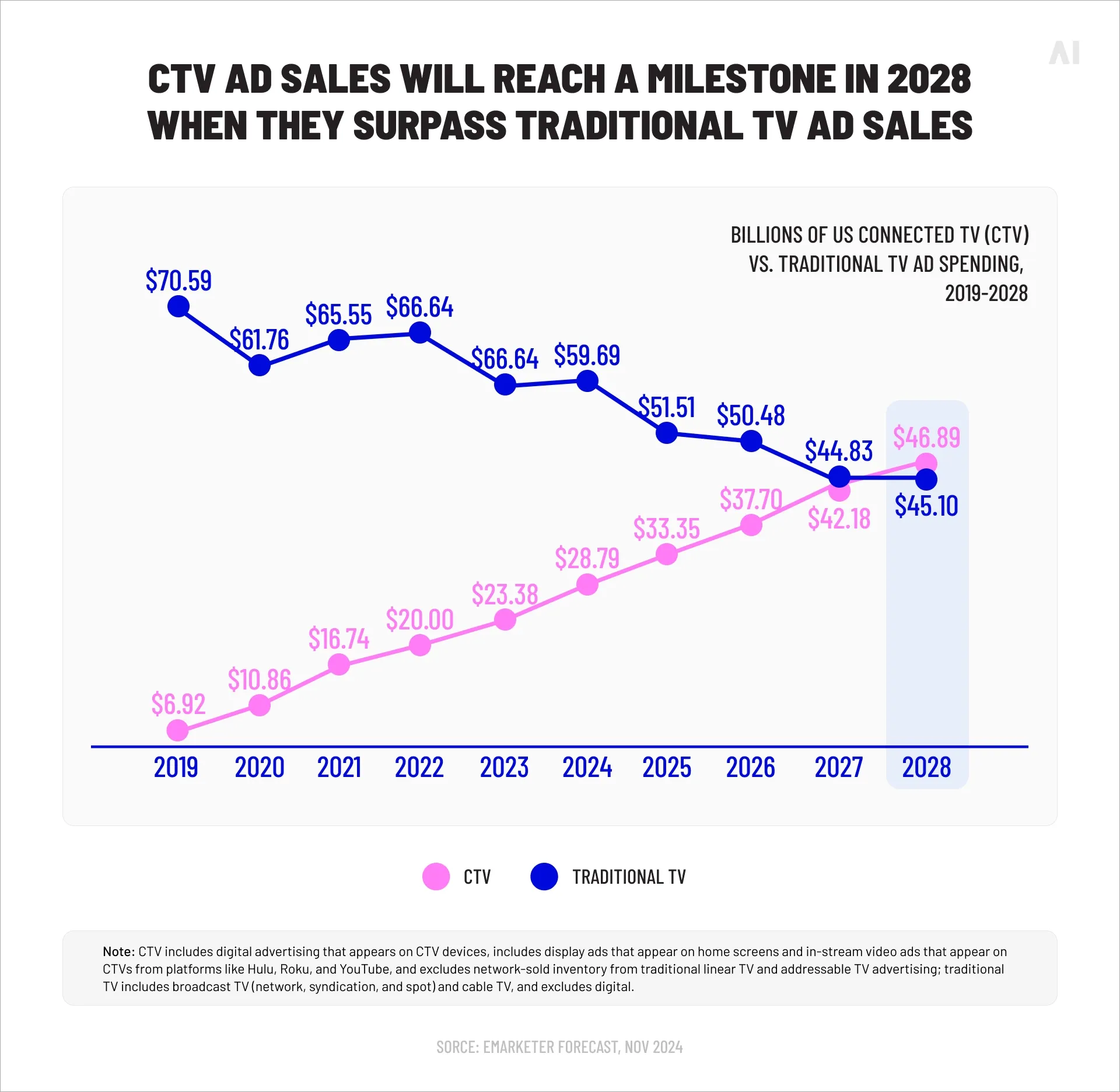Viewers now bounce between smart TVs, streaming services, set-top boxes, and mobile apps. In the US, connected TV (CTV) ad spend is forecast to reach around $33.35 billion in 2025, up 15.8% year on year, with eMarketer expecting it to climb toward $47 billion by 2028 as CTV ad sales overtake traditional TV.At the same time, digital video as a whole—including CTV—is projected to hit about $72 billion and capture nearly 60% of all US TV and video ad budgets in 2025, after growing 18% in 2024.