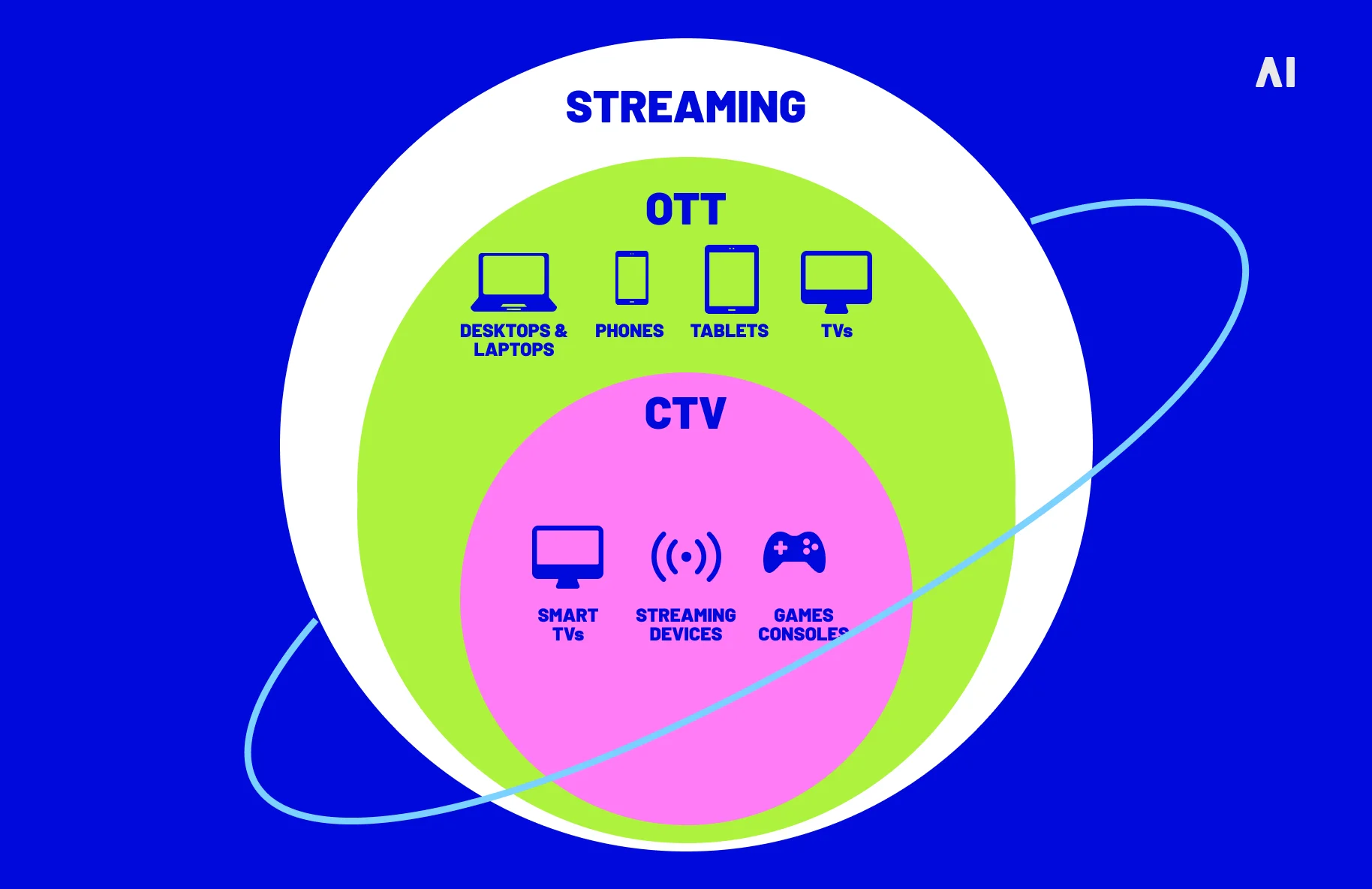 OTT and CTV are closely related but not identical. OTT is an umbrella term for all streaming content delivered over the internet, no matter the device. CTV, or Connected TV, refers specifically to OTT content watched on a television screen, such as a smart TV or a regular TV connected via a device like Roku or Apple TV. All CTV is OTT, but not all OTT is CTV—for example, watching Netflix on your smart TV is both OTT and CTV, while watching the same show on your phone is OTT but not CTV. This distinction matters to advertisers because CTV often commands premium pricing due to the large-screen, living room environment, while mobile OTT may have different engagement and pricing.