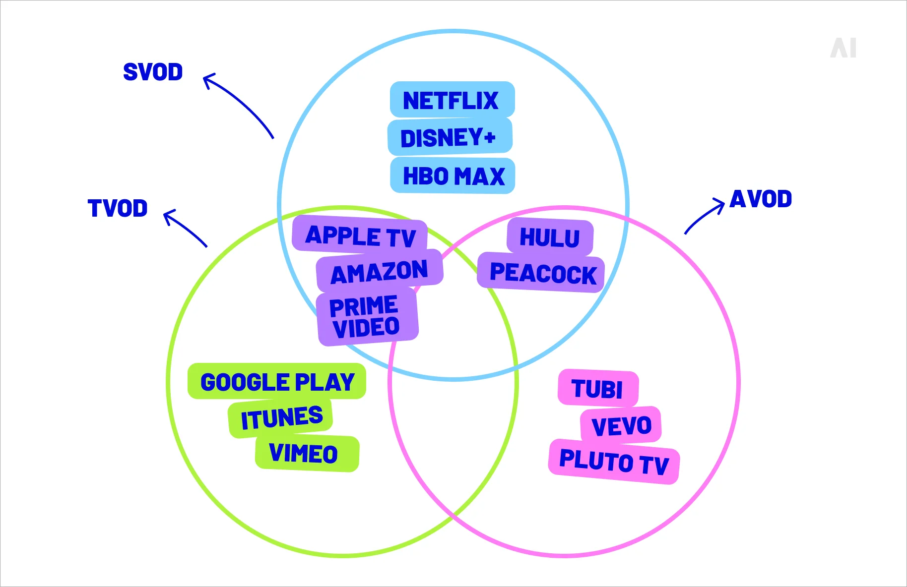 AVOD (Advertising VOD): Pluto TV, Tubi, the ad-supported tiers of Hulu and Peacock