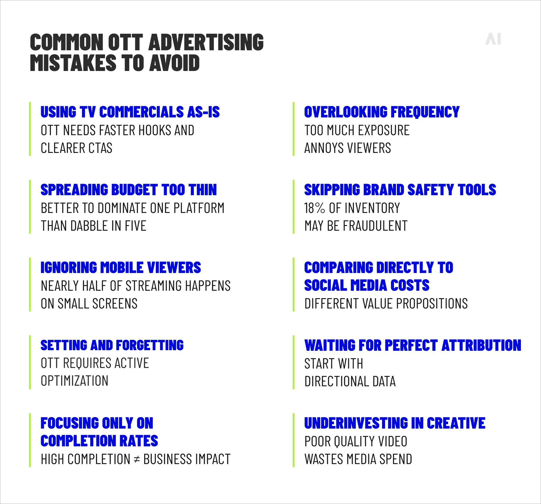 OTT advertising's biggest hurdle is platform fragmentation, with each streaming service requiring different specs and reporting systems. Ad fraud threatens campaigns, affecting up to 18% of inventory, while measurement complexity makes cross-device tracking and attribution challenging. Creative demands multiply as platforms require various video formats, and frequency capping proves difficult without sophisticated tools. Competition for premium inventory drives costs higher, and evolving privacy regulations add another layer of complexity. Success typically requires specialized expertise or partnering with agencies who understand this rapidly changing landscape.